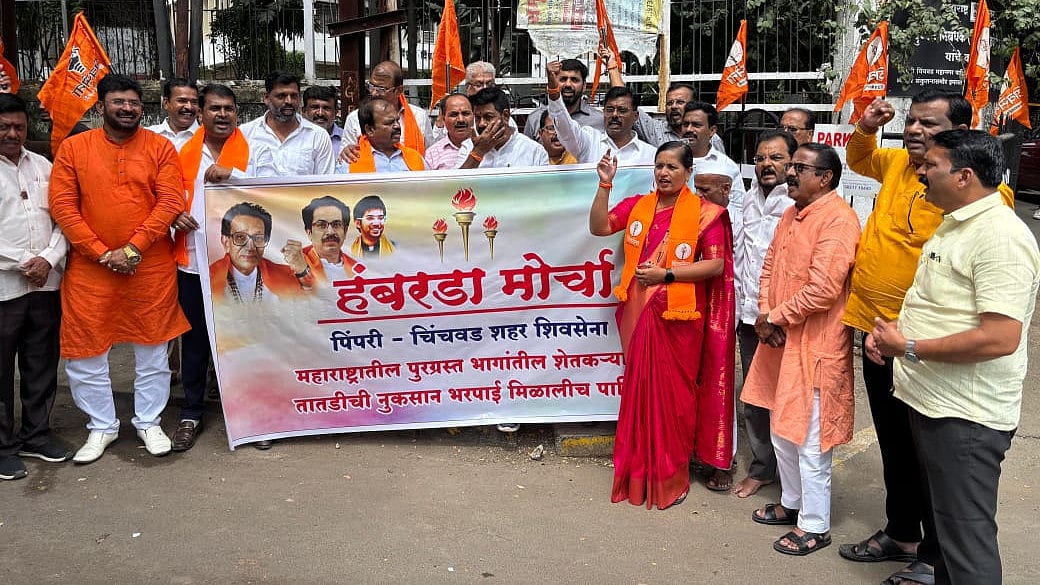 The Shiv Sena (Uddhav Balasaheb Thackeray) Pimpri-Chinchwad city unit held a protest march on Wednesday in front of the Tehsildar’s office in Nigdi. The party demanded adequate compensation for farmers affected by excessive rainfall and called for a complete loan waiver for farmers across Maharashtra.
