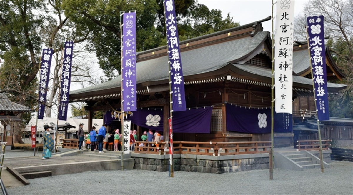 スタンプラリーのポイントのひとつには、菊池一族ゆかりの北宮阿蘇神社があり、訪れる人々に歴史の魅力を伝えています。
