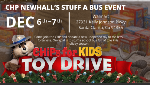 The California Highway Patrol’s Newhall-area Office has started its annual toy drive, according to officials. In addition to starting the collection now, officers are planning the annual “stuff-a-bus” event for Dec. 6-7 at the Walmart off Kelly Johnson Parkway. “Come join the CHP and donate a new unopened toy to the less fortunate,” read a statement to promote the drive. “The Newhall-area Office will be hosting an event to stuff a bus in Santa Clarita,” said Officer Carlos Burgos-Lopez, spokesman for the Newhall-area Office. “The goal is to stuff a bus full of toys in order to meet our mission of getting a toy into the hands of every kid in need this holiday season.” He said this year marks the law enforcement agency’s 37th of doing the drive. The agency has several collection baskets set up throughout the community with businesses that agreed to help out, Burgos-Lopez added. Residents might notice a basket outside of their local Walgreens pharmacy, he said, and there will also be officers in front of the Walmart on Kelly Johnson Parkway from Wednesday through Sunday prior to the stuff-a-bus event. For more information on how to make a donation, contact the station at 661-600-1600.