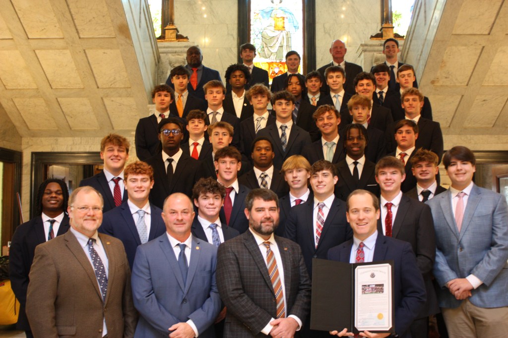 Sens. Jeff Tate, Tyler McCaughn, and Rep. Billy Adam Calvert on Thursday led the presentation of Senate Resolution 25 to the Lamar School Raiders Football Team and Head Coach Jacob Land. The resolution honored the team for winning the MAIS 4A Division III State Championship by defeating Brookhaven Academy 34-17 on November 22.